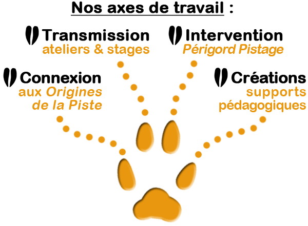 Nous œuvrons à promouvoir et développer l’Art du Pistage en Périgord (et plus largement) à travers nos ateliers & stages originaux et variés, à travers nos livrets & jeux pédagogiques, nos connexions aux Peuples Premiers qui pistent toujours de manière active, et à travers notre groupe Périgord Pistage qui vise à redonner une utilité sociale à notre passion !